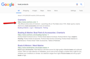 Untuk istilah penelusuran "produk berperahu", Overton adalah nomor satu, tetapi West Marine ketiga.
